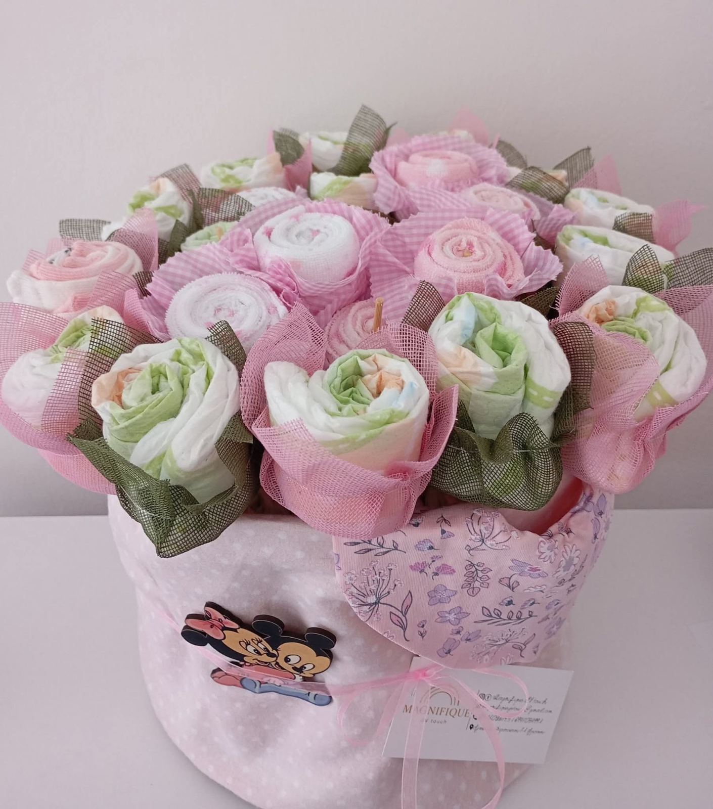 •30 πάνες •8 πανάκια ώμου •2 ζευγάρια καλτσάκια •1 πάνα αγκαλιάς •1 ποδιά • Ξύλινα διακοσμητικά •Τούλι γύρω από κάθε πάνα